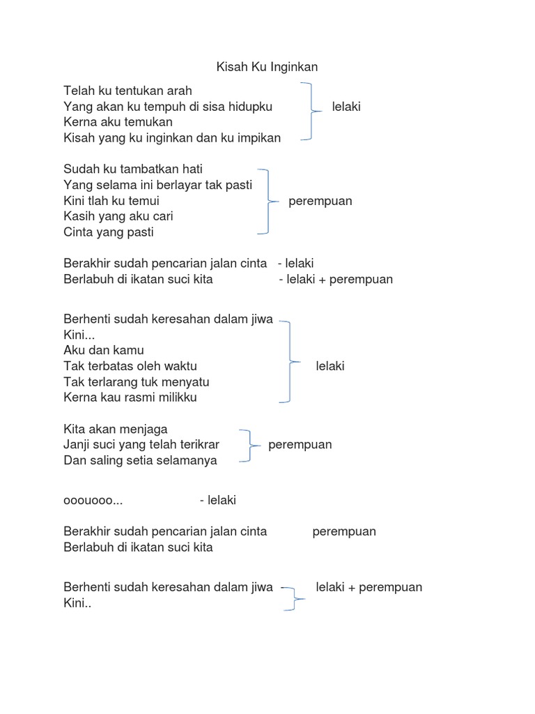 Lirik Lagu Kisah Ku Inginkan / Видео kisah ku inginkan feat.. Jika anda penasaran, saat ini lagu kisah ku inginkan bisa anda dengarkan di beberapa media streaming musik, salah satunya deezer. Kisah yang ku inginkan dan ku impikan sudahku tambatkan hati yang selama ini berlayar tak pasti kini telahku temui kasih yang aku cari cinta yang pasti berakhir sudah pencarian jalan cinta berlabuh di ikatan suci kita berhenti sudah keresahan dalam jiwa kini aku dan kamu tak terbatas oleh waktu. Berakhir sudah pencarian jalan cinta berlabuh di ikatan. Telah ku tentukan arah yang akan ku tempuh di sisa hidupku karna tlah ku temukan kisah yang ku inginkan dan ku impikan. Lirik lagu terbaru dato siti nurhaliza feat judika.